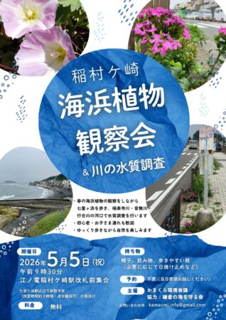 2026年5月5日(火) 9時30分 稲村ケ崎駅改札付近に集合し、海岸の海浜植物調査を実施いたします。【参加自由】海岸の現状に興味のある方、地域の活動に興味のある方などどなたでも参加できます。
